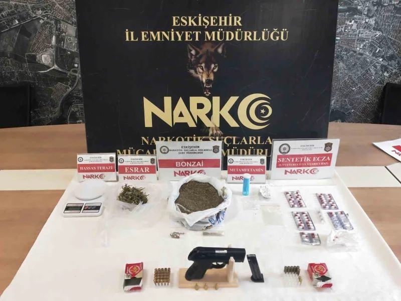 Şüphelilerin üzerinde ve belirlenen adreslerde yapılan aramalarda; bin 172 ecstasy hap, 169 adet sentetik hap, 772,78 gram esrar, 440,71 bonzai, 266,52 gram metamfetamin, 26,60 gram reçine esrar, 9 hassas terazi, 3 tabanca ve 46 fişek, 3 tüfek, sigara sarma makinesi ve kompresör, yaklaşık 5 kilogram kıyılmış tütün ve 3 bin 200 dal sarılmış sigara ele geçirildi.