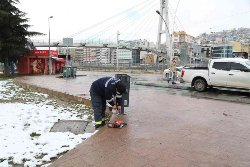 Kocaeli Büyükşehir Belediyesi Park, Bahçe ve Yeşil Alanlar Daire Başkanlığı tarafından, İzmit’te yeni çöp kovalarının montajı yapılıyor.