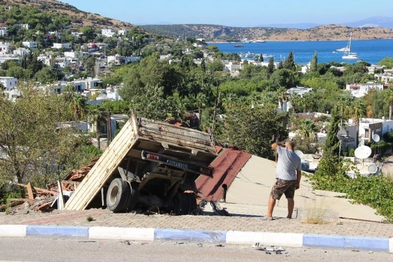 Muğla’nın Bodrum ilçesinden bir evin çatısından içeriye kamyonet girdi, 2 kişi yaralandı. Evinde torunuyla birlikte salça yapan yaşlı teyze ise evin içerisinde kamyonet görünce şoka girdi.