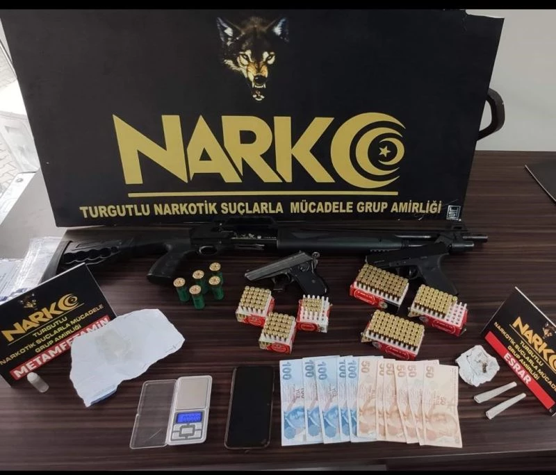 Manisa İl Emniyet Müdürlüğü Turgutlu Narkotik Suçlarla Mücadele Grup Amirliği görevlilerince uyuşturucu veya uyarıcı madde ticareti yapan, nakleden ve kullanan şahıslara yönelik yapılan çalışmalar çerçevesinde, Turgutlu ilçesinde N.K.Y. (50) isimli şahsın ikametinde ve iş yerinde arama yapıldı. Aramalarda; 2,78 gram metamfetamin maddesi, 2 parça halinde 3,39 gram esrar maddesi, 1,41 gram kenevir tohumu, 1 adet hassas terazi, 2 adet tabanca, 1 adet tüfek, 209 adet fişek ele geçirildi. Uyuşturucu veya uyarıcı madde imal ve ticareti yapmak suçundan gözaltına alınan zanlı, sevk edildiği adli makamlarca tutuklandı.