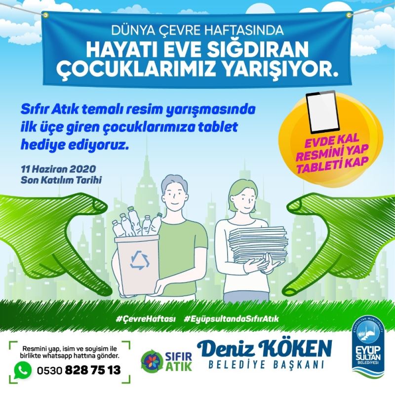 Eyüpsultan Belediyesi Temizlik İşleri Müdürlüğü tarafından organize edilen sıfır atık temalı resim yarışmasında, ilk üçe giren çocuklara tablet hediye edilecek. Sıfır atık temalı resim yarışmasına katılmak için, çizdiği resmin fotoğrafını tam kareye sığacak şekilde çeken çocuklar isim ve soyadıyla birlikte fotoğraflarını whatsapp hattından gönderebilecekler. Ayrıca yarışmaya sadece Eyüpsultan ilçesinde ikamet eden çocuklar katılabilecek. Son katılım tarihi 11 Haziran 2020 Perşembe günü olurken, yarışmanın sonuçları 15 Haziran Pazartesi günü Eyüpsultan Belediyesi resmi sitesinden yayınlanacak.