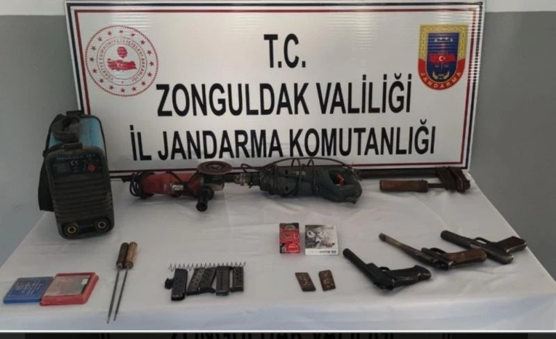 Edinilen bilgiye göre Zonguldak İl Jandarma Komutanlığı ekiplerince Devrek İlçesi Türkmenoğlu Köyü’nde kaçak silah imal ettiği ve silah sattığı tespit edilen N.G., isimli şahıs evine operasyon düzenlendi. Operasyonda şahsın evinde yapılan aramada 3 adet tabanca, 85 adet muhtelif çapta tabanca fişeği, 5 adet tabanca şarjörü, 2 adet tabanca kabzesi, 1 kutu tabanca bakım kiti, 12 adet fişek kapsülü, 26 adet tek kurşun bilyesi, 15 adet plastik tapa, 1 adet keçe tapa, 1 adet zımpara, 2 adet eye, 2 adet matkap, 1 adet spiral makinesi, 1 adet mengene, 1 adet kaynak makinesi ele geçirildi. Şüpheli hakkında 6136 sayılı kanuna muhalefet suçundan adli işlem başlatıldı.