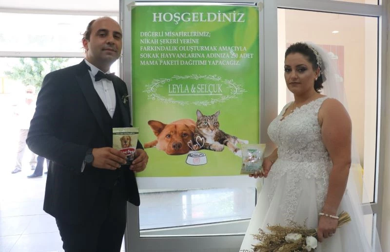 Gelin Leyla Yıldırım Ceyhan, hayvanların korunması gerektiğine değinerek, “Nikah şekeri yerine kedi ve köpeklere mama dağıtmaya karar verdik. Çünkü onlara yardımcı olmamız gerekiyor. Boşa harcayacakları parayı bir magnet için ya da hediyelik için kedi köpek mamasını tercih ettik. Herkesin de tercih etmesini dileriz. Hayvanları korumamız gerek. Onlara yardımcı olmamız gerek” şeklinde konuştu.