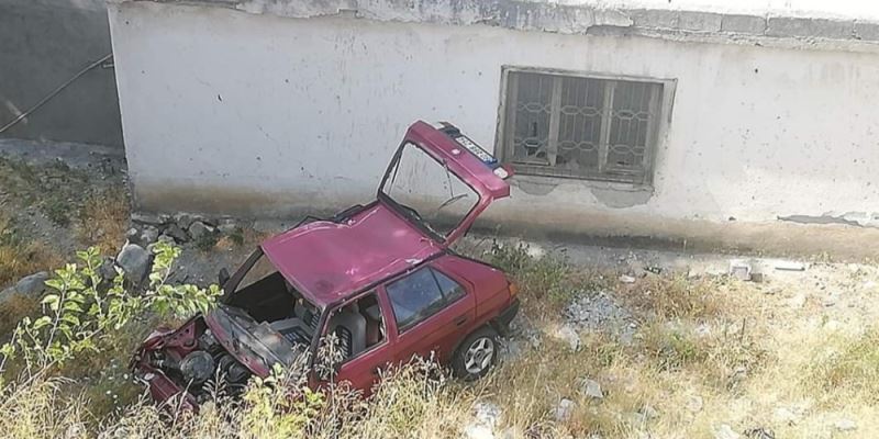 Hatay’ın Erzin ilçesinde el freni çekilmeyen otomobil, yaklaşık 10 metre yükseklikten bir evin avlusuna düşerek hurdaya döndü.