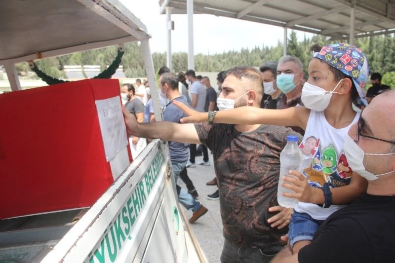 Adana’daki evinde cansız bedeni bulunan özel harekat polisinin bugün yapılan cenaze töreninde 6 yaşındaki oğlu, babasının bayrağa sarılı tabutuna son kez dokunurken yürekleri dağladı.