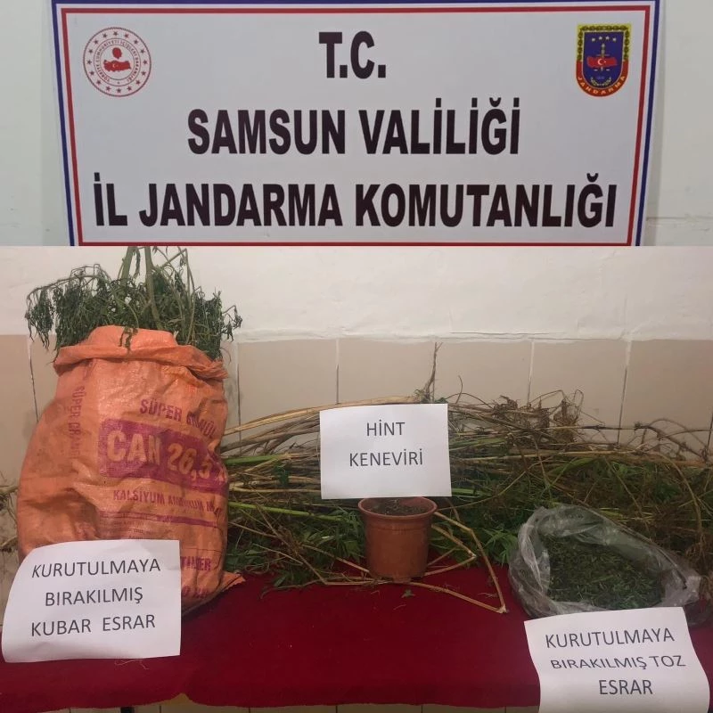 Edinilen bilgiye göre, Çarşamba İlçe Jandarma Karakol Komutanlığı tarafından yürütülen istihbari çalışma ve takip neticesinde Ataköy Mahallesi’nde H.T. (44) isimli şahsın evinin bahçesinde ve serasında yasa dışı kenevir ekimi yaptığı bilgisi alındı. İstihbarat Şube ve KOM Şube Müdürlüğü ekipleri ile birlikte şahsın evinde ve eklentilerinde yapılan aramada 500 gram Kurutulmaya bırakılmış toz esrar, 4 kg kurutulmaya bırakılmış kubar esrar, boyları 50 cm ile 170 cm aralığında değişen toplam 65 kök kenevir bitkisi tespit edildi.