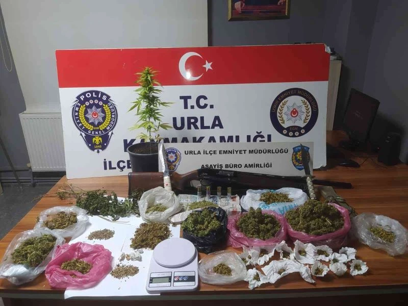 Urla Emniyet Müdürlüğü ekiplerinin yaptığı denetimlerde bir şahsın evinde uyuşturucu madde üretimi yaptığı ve sattığı ihbar edildi. İhbar üzerine yürütülen çalışmalar sonucu şüpheli şahsın 29 yaşında A.İ. olduğu tespit edildi. Bunun üzerine harekete geçen Urla Emniyet Müdürlüğüne bağlı ekipler, şüpheli şahıs A.İ.’yi evinde uyuşturucu maddelerle beraber kıskıvrak yakaladı. Şahsın evinde yapılan aramalarda toplam 587 gr esrar, 10 kök Hint keneviri, 1 adet hassas terazi, 1 adet öğütücü 2 adet "Rambo" tabir edilen bıçak, 1 adet av tüfeği ele geçirildi. Polis tarafından gözaltına alınan şüpheli A.İ., emniyetteki işlemlerin ardından adli makamlarca tutuklanarak cezaevine gönderildi.