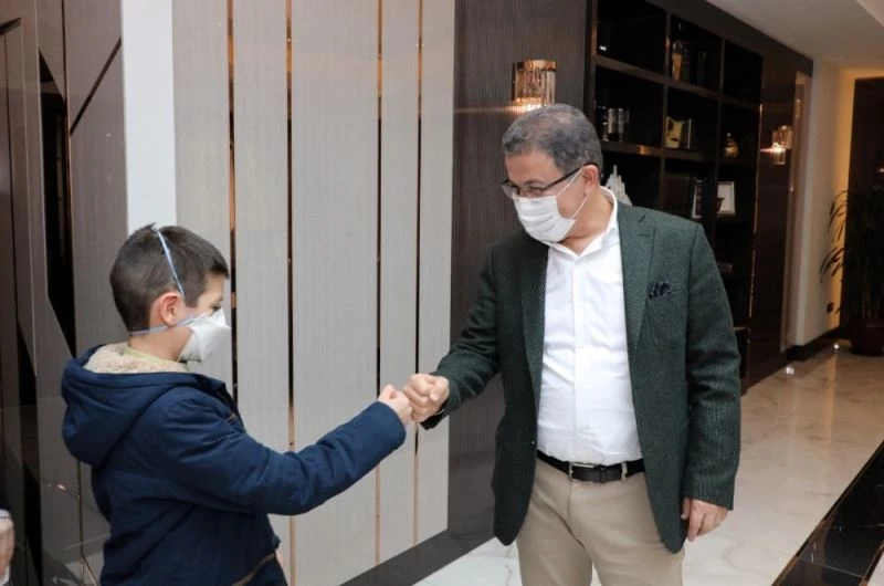 Başkan Deniz Köken, sohbet sonrası Mustafa Şen ve ailesiyle hatıra fotoğrafı çektirip, yarışmada kazandığı yeni nesil notebook’u takdim etti.
