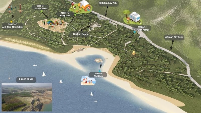Çiftalan Mahallesi sahilinde 5 bin metrekarelik kamp ve 5 bin metrekarelik plaj alanı düzenlemesi ile aynı anda 200 kişiye kamp yapabilme imkanını sunan projede spor alanları, sanat ve beceri atölyeleri, çeşitli etkinlik alanları, macera parkı, toplantı salonları yer alacak. Mavi ve yeşilin buluştuğu doğal güzellikleri ve zengin aktivite alanları ile gençlere unutamayacakları bir kamp deneyimi yaşatacak proje kapsamında vatandaşlar için ise halk plajı, karavan kamp alanı ve belediye sosyal tesisleri de bulunacak.