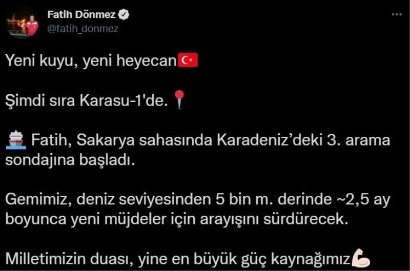Enerji ve Tabii Kaynaklar Bakanı Fatih Dönmez, sosyal medya hesabından “Yeni kuyu, yeni heyecan” başlığıyla yaptığı paylaşımda, yeni kuyu Karasu-1’de Fatih sondaj gemisinin Karadeniz’de bulunan Sakarya Gaz Sahası’nda 3. arama sondajına başladığını açıkladı. Bakan Dönmez, Fatih’in deniz seviyesinden 5 kilometre derinde 2 buçuk ay boyunca yeni müjdeler için arayışını sürdüreceğini belirtti. Dönmez, “Milletimizin duası, yine en büyük güç kaynağımız” dedi.