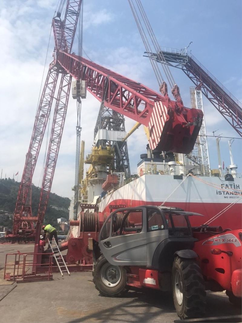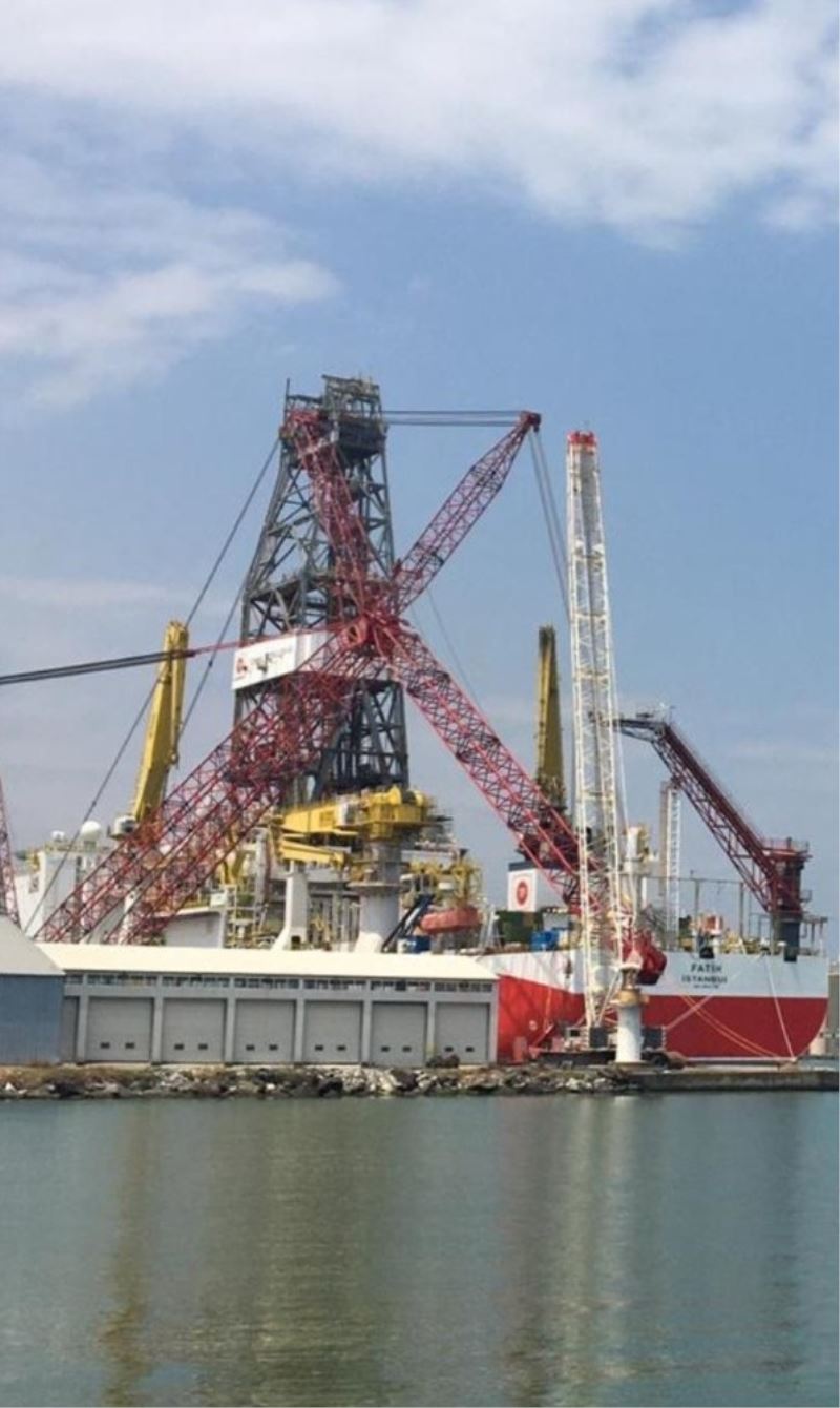 Karadeniz’de sondaj faaliyeti gerçekleştirmek için İstanbul’dan Trabzon’a gelen Fatih Sondaj Gemisi’nin İstanbul Boğazı’ndan Karadeniz’e açılırken sökülen yaklaşık 60 metre yüksekliğinde 860 ton ağırlığında iki adet kulenin montajının tamamlanmasının ardından dev vincin sökümüne başlandı.