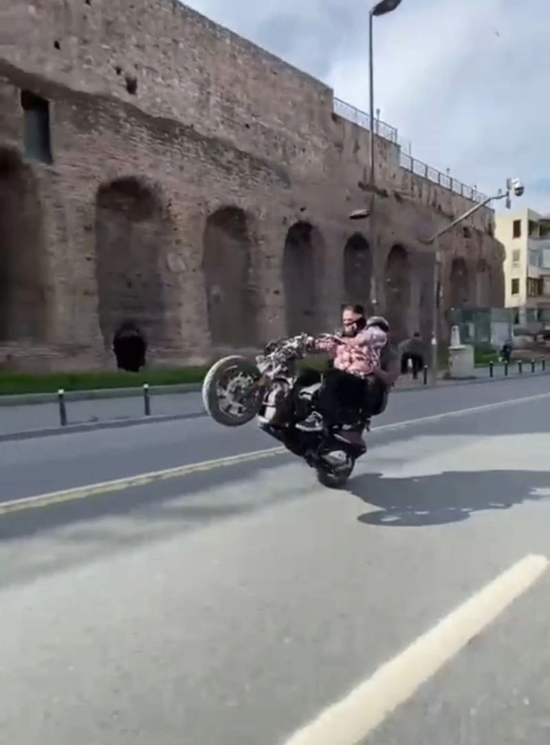 Olay, geçtiğimiz günlerde Unkapanı Atatürk Caddesi üzerinde meydana geldi. Motosikletinin arka koltuğuna arkadaşını bindiren sürücü, Unkapanı Köprüsü’nde Aksaray istikametine giderken tek tekerlek gösterisi yaptı. Metrelerce motosikletin önünü kaldırarak giden sürücüyü başka bir motosikletli arkadaşı cep telefonu kamerasıyla kayıt altına aldı. Motosikletli gençlerin tehlike saçtığı o anlar sosyal medya hesaplarından da paylaşıldı.