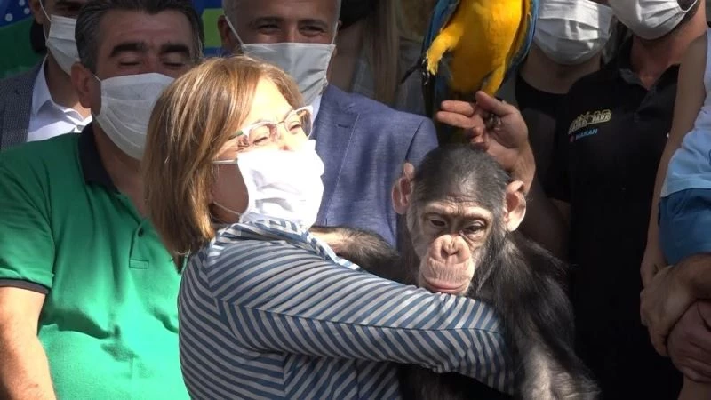 Büyükşehir Belediye Başkanı Fatma Şahin, konuşmasını tamamladıktan sonra, "Can bir selam ver" diyerek, mikrofonu yanındaki şempanzeye uzattı. Öfkeli maymun, eline aldığı mikrofonu bu kez ise yere attı.