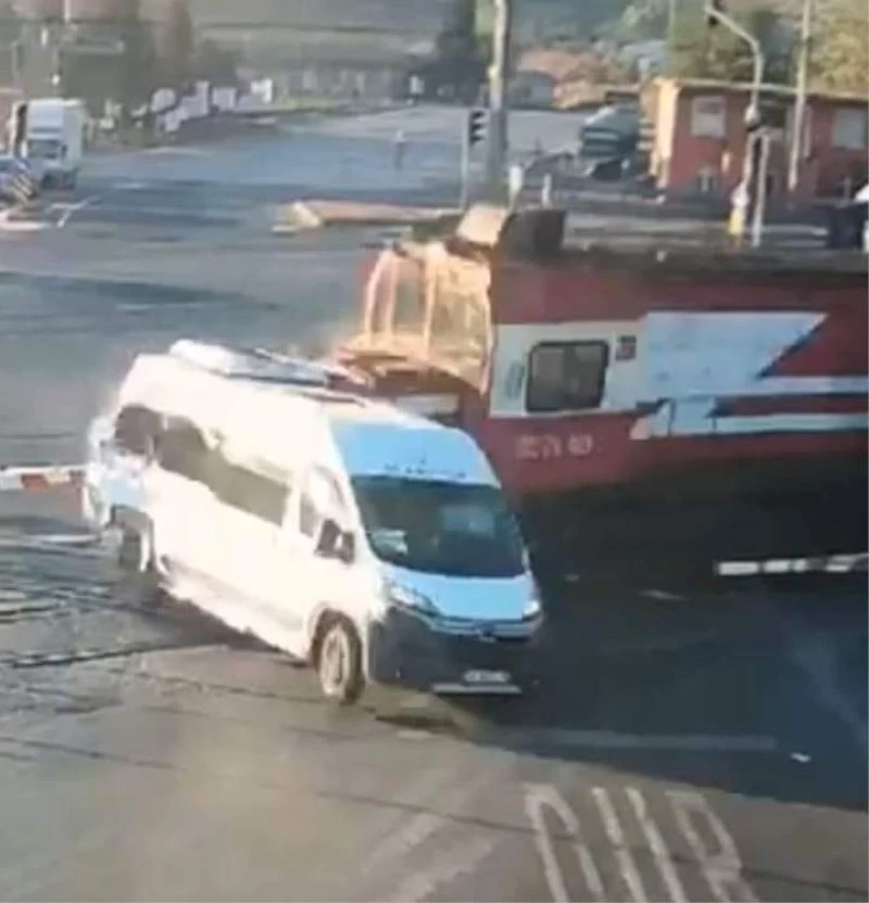 Tekirdağ’ın Ergene ilçesindeki hemzemin geçitte sabah saatlerinde yük treni ile içerisinde 13 kişinin bulunduğu işçi servisinin karıştığı kazanın güvenlik kamerası görüntüleri ortaya çıktı. Güvenlik kamerası görüntülerinde yük treni bir anda servis minibüsünü önüne alıp metrelerce ilerliyor.