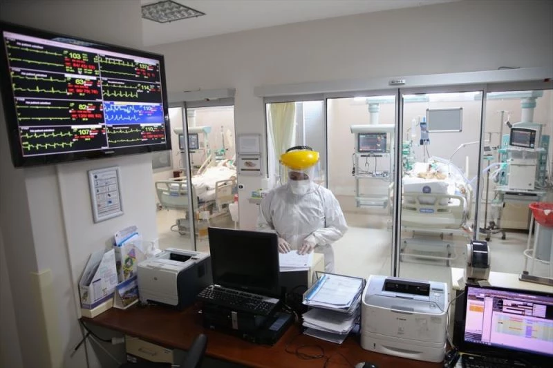 Anesteziyoloji ve Reanimasyon Ana Bilim Dali Ögretim Üyesi Prof. Dr. Murat Yilmaz'in sorumlulugunda, tip fakültesinin yogun bakim ünitesinde çalisan saglik çalisanlari rahatsizligi ilerleyen hastalarin durumunu titizlikle takip ediyor.