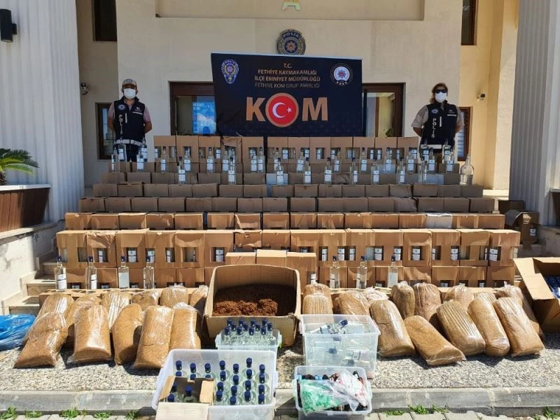 Muğla’nın Fethiye ilçesinde turizm sezonu öncesi çok sayıda kaçak içki ve imalatında kullanılan malzeme ile bandrolsüz tütün polisin başarılı operasyonu ile ele geçirildi.