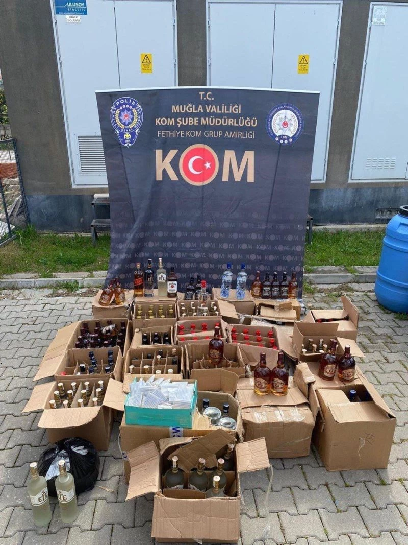 Muğla’nın Fethiye ilçesinde polisin düzenlendiği operasyonda 290 şişe kaçak içki ve 2 bin 400 makaron ele geçirildi.