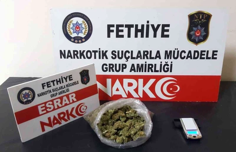 Fethiye Narkotik Suçlarla Mücadele Grup Amirliği ekiplerince yapılan saha çalışmasında M.Y isimli şahsın uyuşturucu madde sattığı bilgisi alındı. M.Y isimli şahıs Fethiye ilçesi girişinde yakalanarak yapılan adli aramada, iç çamaşırına gizlenmiş vaziyette 64,41 gr esrar maddesi ile araç anahtarı görünümlü hassas terazi ele geçirildi. M.Y isimli şahıs çıkarıldığı adli makamlarca yurt dışı çıkış yasağı şartıyla serbest bırakıldı.