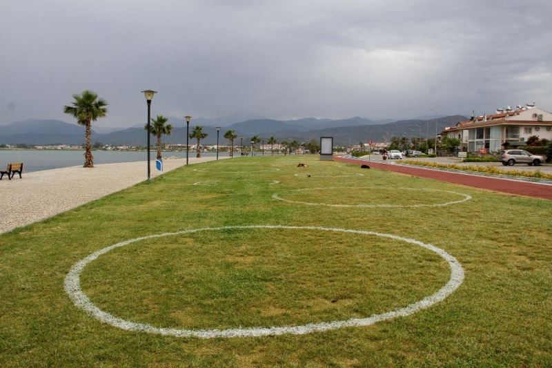Korona virüs önlemleri gevşetilirken, tedbiri elden bırakmayan Fethiye Belediyesi, vatandaşların özellikle akşam saatlerinde uğrak yeri olan sahil bandındaki yeşil alana belirli aralıklarla 3 ve 4 metre çapında çemberler çizdi. Vatandaşlar dinlenirken sosyal mesafe kuralına uyması da sağlanmış olacak. Havanın yağışlı olmasından dolayı vatandaşların yoğun olarak bulunduğu alan ise boş kaldı.