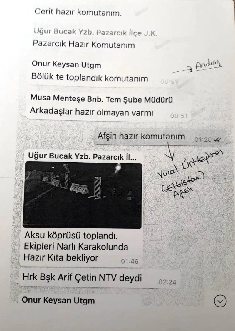 15 Temmuz’da hain darbe girişiminde Kahramanmaraş İl Jandarma Komutanlığı’nda görevli rütbeli askerlerin oluşturdukları Whatsapp grubunda ilçe jandarma komutanlarına verilen hazırlık talimatları ve yazışmaları ortaya çıktı.