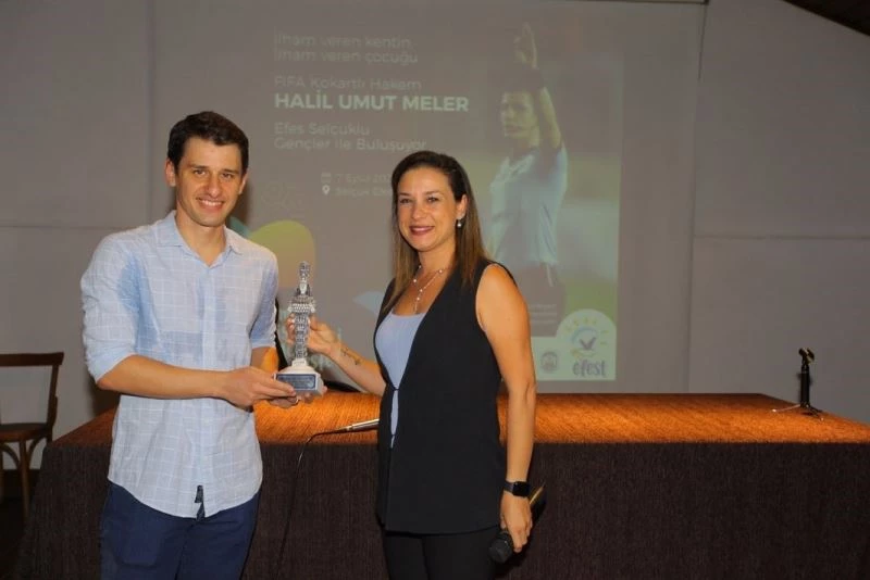 FIFA kokartlı hakem Halil Umut Meler, Selçuk Belediyesi tarafından düzenlenen EFEST kapsamında Selçuk Efes Kent Belleği’nde söyleşiye katıldı. Küçük yaşlardan itibaren futbol ile iç içe olan Meler, hakemlik kariyerine başladıktan sonra yakaladığı başarının sırrını paylaşarak, “Her zaman futbol oynamak istiyordum. Babam o zaman yöneticilik yapıyordu. Ben de babamın tavsiyeleri ile hazırlık maçlarını yönetmeye başladım. Babamdan ilham aldım diyebilirim. İlham veren kentin ilham veren babası olur” diye konuştum.
