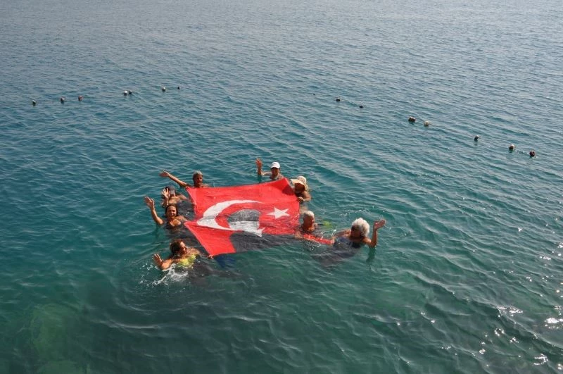 Antalya’nın Finike ilçesinde 30 Ağustos Zafer Bayramı etkinlikleri kapsamında bir grup kadın, denize girerek Mustafa Kemal Atatürk’ünde resminin bulunduğu Türk Bayrağını açarak 30 Ağustos’u kutladı.