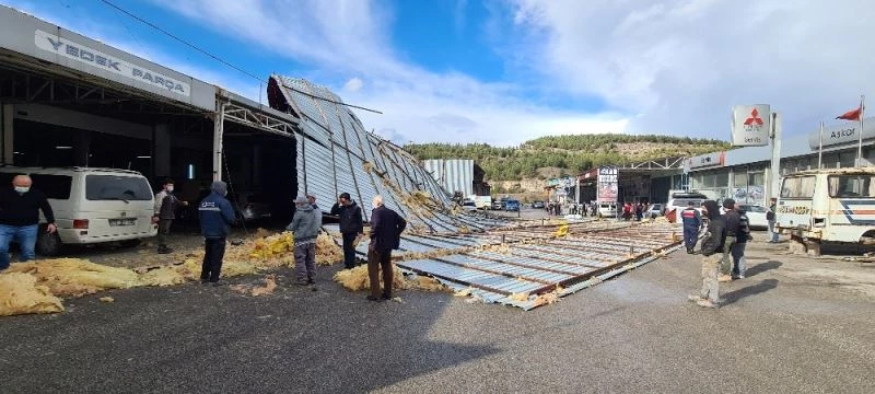 Karabük’te etkili olan şiddetli fırtına nedeniyle sanayi sitesindeki dükkanların çatılarının uçması sonucu 4 araç zarar gördü.