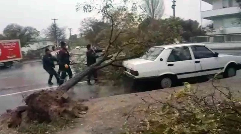 Fırtınada ağaç kökünden söküldü, aracın üzerine devrildi