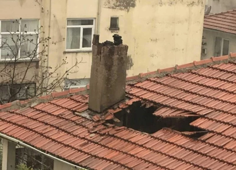 Fırtınada kopan bacanın parçası çatıda hasara neden oldu