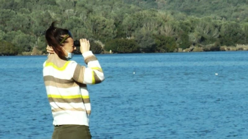 Flamingoları izlemek için Milas ve Bodrum’dan gelen vatandaşlar ellerinde dürbünlerle flamingoları izledi.