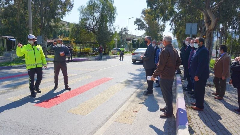 İçişleri Bakanlığının 81 ilde başlattığı kırmızı çizgi uygulaması kapsamında, İzmir’in Foça ilçesinde de bir program düzenlenerek yayalara kırmızı çizgi çekildi.
