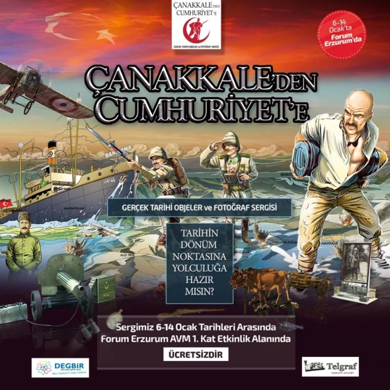 Türkiye’yi dolaşan Çanakkale Müzesi ve Fotoğraf Sergisi, 6-14 Ocak 2021 tarihleri arasında Forum Erzurum’da yerini alacak. Çanakkale ruhunun savaştan kalma malzemeler ve fotoğraflarla sunulan sergide savaş zamanında kullanılan gerçek malzemeler, döneme ait üniformalarla giydirilmiş askerler, Çanakkale’yi yansıtan yapılarla ilgili maketler ve 100 yıl öncesinin fotoğrafları yer alıyor.