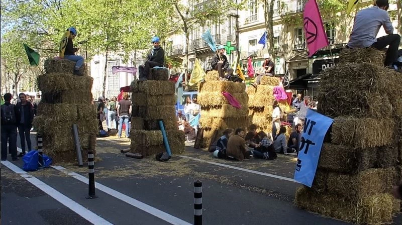 İklim aktivistleri Fransa Cumhurbaşkanı Emmanuel Macron ve Cumhurbaşkanı Adayı Marine Le Pen’in çevre programlarını protesto etmek için Türk mahallesindeki büyük bulvarda bir araya geldi. Kamyonlarla getirdikleri saman balyalarını bulvara koyan Yokoluş İsyanı adlı çevreci grup, bulvardan araçların geçmesine engel olarak oturma eylemi düzenledi. Oturma eyleminin ardından iklim aktivistleri bulvarda dans ederek meditasyon yaptı.