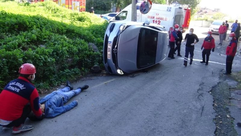 Zonguldak’ın Ereğli ilçesinde sürücüsünün fren yerine gaza bastığı otomobil önce yayaya çarptı, ardından da yol kenarındaki taşlara çarparak yan yattı.