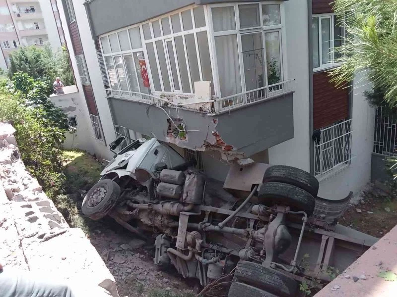 Kahramanmaraş’ta freni boşalan su tankeri otomobile çarptıktan sonra bir apartmanın bahçesine düştü.