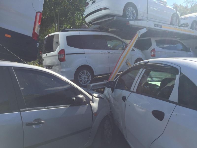 Elazığ’da sıfır araç taşıyan tır, freni boşalması sonucu otoparka dalarak 5 aracı biçti, kazada 1 kişi yaralandı.