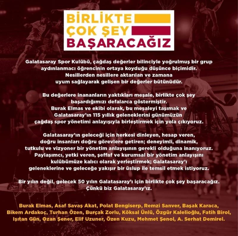 Galatasaray’ın eski yöneticilerinden Burak Elmas, sarı-kırmızılılarda yapılacak başkanlık seçiminde aday olduğunu daha önce açıklamıştı. Elmas, ’Birlikte çok şey başaracağız’ sloganıyla birlikte ekibini duyurdu. Seçim kampanyası için kurulan ’Birlikte Çok Şey Başaracağız’ isimli sosyal medya hesabından yapılan açıklamada, "Galatasaray Spor Kulübü, çağdaş değerler bilinciyle yoğrulmuş bir grup aydınlanmacı öğrencinin ortaya koyduğu düşünce biçimidir. Nesillerden nesillere aktarılan ve zamana uyum sağlayarak gelişen bir değerler bütünüdür. Bu değerlere inananların yaktıkları meşale, birlikte çok şey başaracağımızı defalarca göstermiştir. Burak Elmas ve ekibi olarak, bu meşaleyi taşımak ve Galatasaray’ın 115 yıllık geleneklerini günümüzün çağdaş spor yönetimi anlayışıyla birleştirmek için yola çıkıyoruz. Galatasaray’ın geleceği için herkesi dinleyen, hesap veren, doğru insanları doğru görevlere getiren; deneyimli, dinamik, tutkulu ve vizyoner bir yönetim anlayışının gerekli olduğuna inanıyoruz. Paylaşımcı, yetki veren, şeffaf ve kurumsal bir yönetim anlayışını kulübümüze kalıcı olarak yerleştirmek; Galatasaray’ı geleneklerine ve geleceğe yakışır bir üslup ile temsil etmek istiyoruz. Bir yılın değil, gelecek 50 yılın Galatasaray’ı için birlikte çok şey başaracağız. Çünkü biz Galatasaray’ız" denildi.
