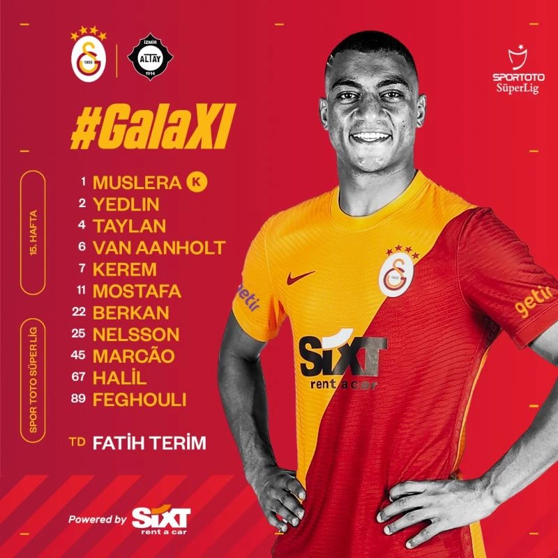 Galatasaray, Altay karşısına; Fernando Muslera, DeAndre Yedlin, Victor Nelsson, Marcao, Patrick van Aanholt, Berkan Kutlu, Taylan Antalyalı, Sofiane Feghouli, Halil Dervişoğlu, Kerem Aktürkoğlu ve Mustafa Muhammed 11’i ile çıktı.