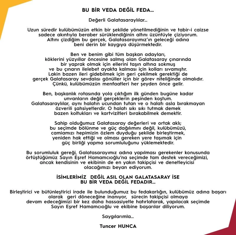 Galatasaray Başkan Adayı Tuncer Hunca, ’Bu bir veda değil, feda’ başlığıyla yayımladığı mesajla adaylıktan çekildiğini duyurdu. Hunca, "Eşref Hamamcıoğlu’na seçimde tam destek vereceğimizi, ancak kendisinin ve ekibinin de en takın takipçisi ve denetleyicisi olacağımızı beyan ederim" ifadelerini kullandı.