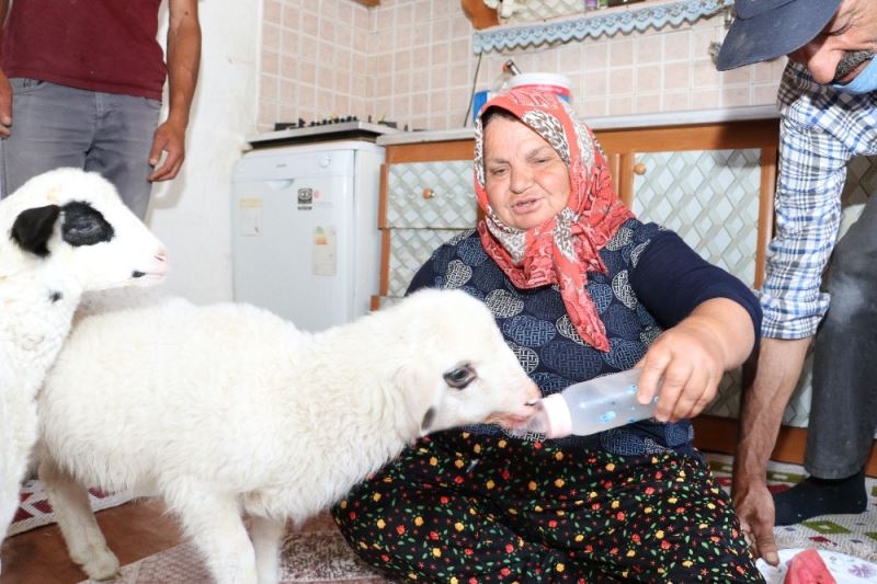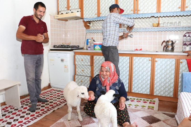 Kuzuların sahibi Murat İmrol (29), “İki tane kuzumuz var. Anneleri öldüler bunların doğumdan sonra. Bunlara biz bakmak zorunda kaldık. Biz ne yersek onlarda onu yiyor. Karpuzdur, yumurtadır, salatadır yani hepsini yiyorlar. Sadece yatmadan yatmaya yerlerimiz ayrı. Bizim de ailemizin bir parçası oldu diyeyim yani. birisinin ismi ’Garip’ birisinin ismi ’Öksüz’ diye koyduk. Çocuk gibi bunlarla ilgileniyoruz” dedi.