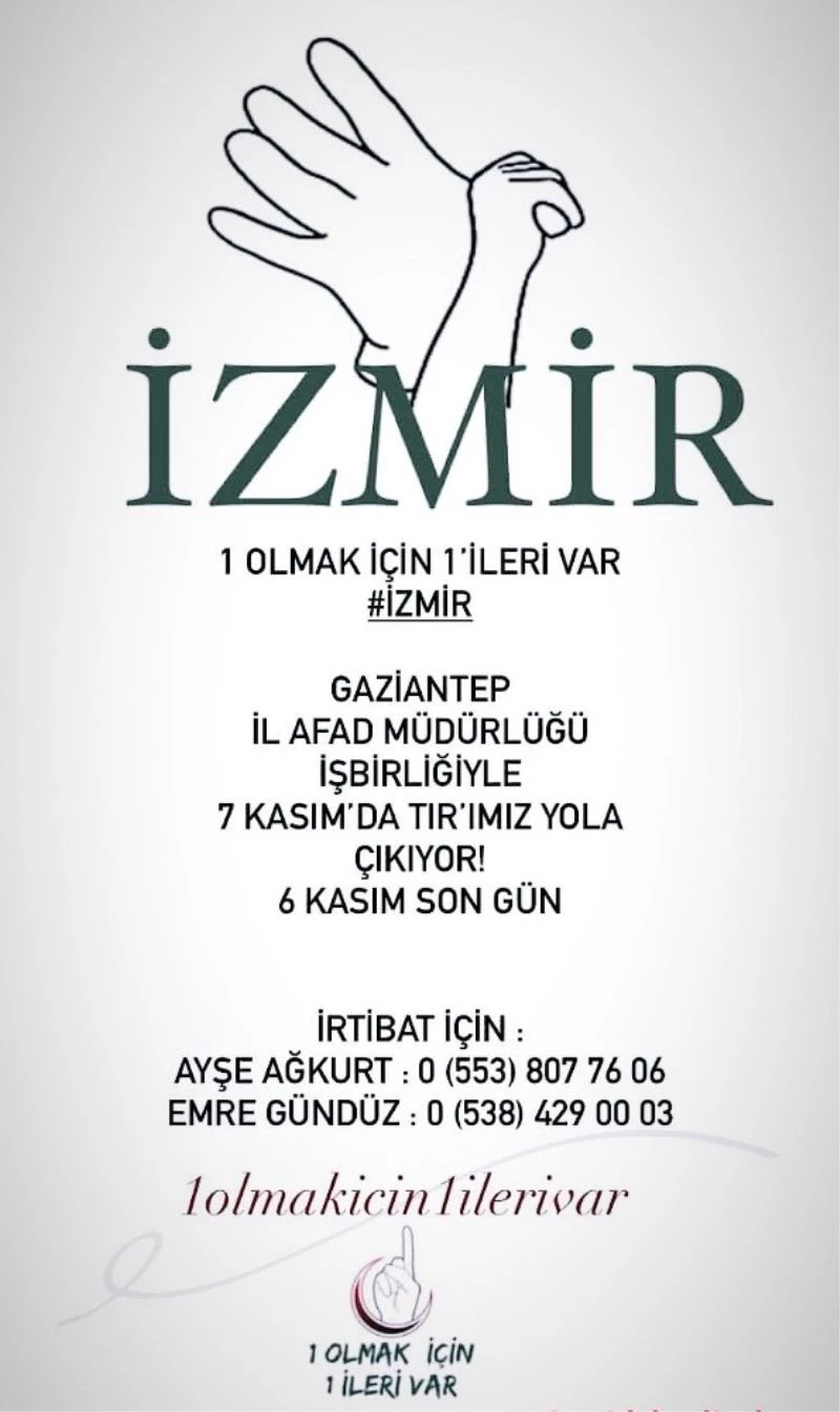 Daha önce Barış Pınarı ve Zeytindalı Harekatı’nda Afrin’deki askerlere, doğu bölgesindeki köy okullarına, kimsesiz ailelere, şehit çocuklarına, kelebek hastası çocuklara ve zor durumdaki ailelere onlarca kez yardım yapan, pandemi sürecinden önce Gaziantep’in çeşitli yerlerinde her hafta çorba dağıtımı gerçekleştiren ve en son Elazığ Depremi’nden kısa süre sonra bir tır yardım malzemesiyle deprem bölgesine giderek depremzedelerin yaralarını saran, Gaziantep Üniversitesi öğrencilerinin kurduğu “1 Olmak İçin 1’ileri Var Hareketi” bu kez de İzmir’deki depremzedelere umut olmak için seferber oldu.