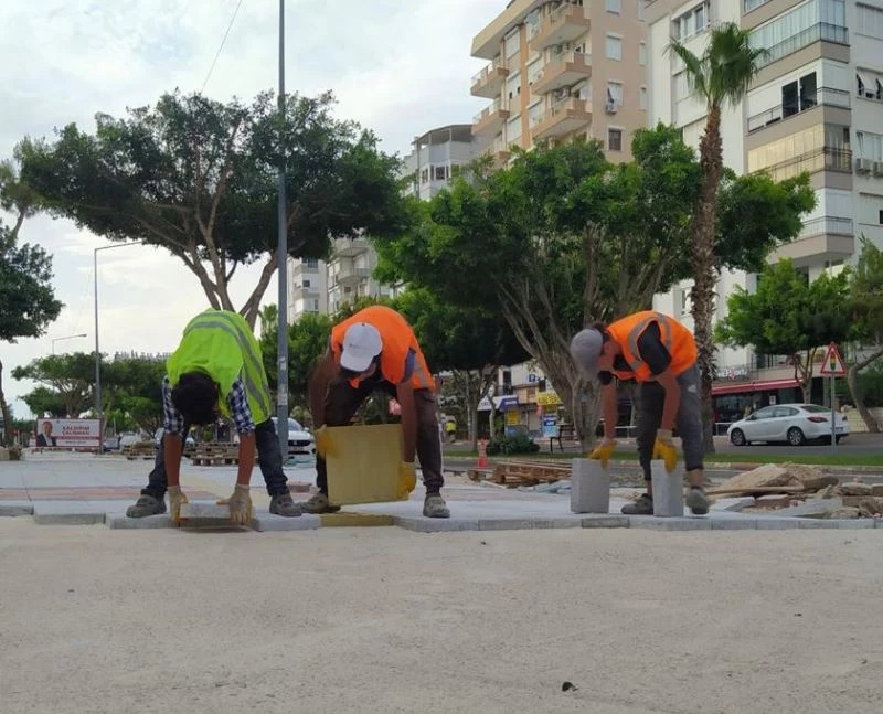 Antalya Büyükşehir Belediyesi’nin Konyaaltı ilçesi Gazi Mustafa Kemal Bulvarı’nda başlattığı kaldırım yenileme çalışması sürüyor. Kaldırım, kent estetiğine uygun mineral taşlarla yenileniyor.