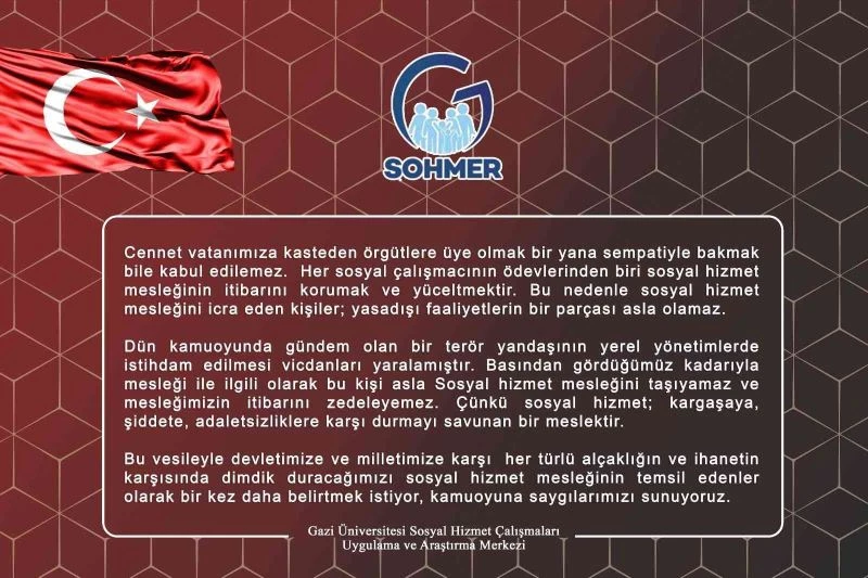 Gazi Üniversitesi Sosyal Hizmet Çalışmaları Uygulama ve Araştırma Merkezi’nden (SOHMER) yapılan açıklamada, “Dün kamuoyunda gündem olan bir terör yandaşının yerel yönetimlerde istihdam edilmesi vicdanları yaralamıştır. Basından gördüğümüz kadarıyla mesleği ile ilgili olarak bu kişi asla sosyal hizmet mesleğini taşıyamaz ve mesleğimizin itibarını zedeleyemez” denildi.