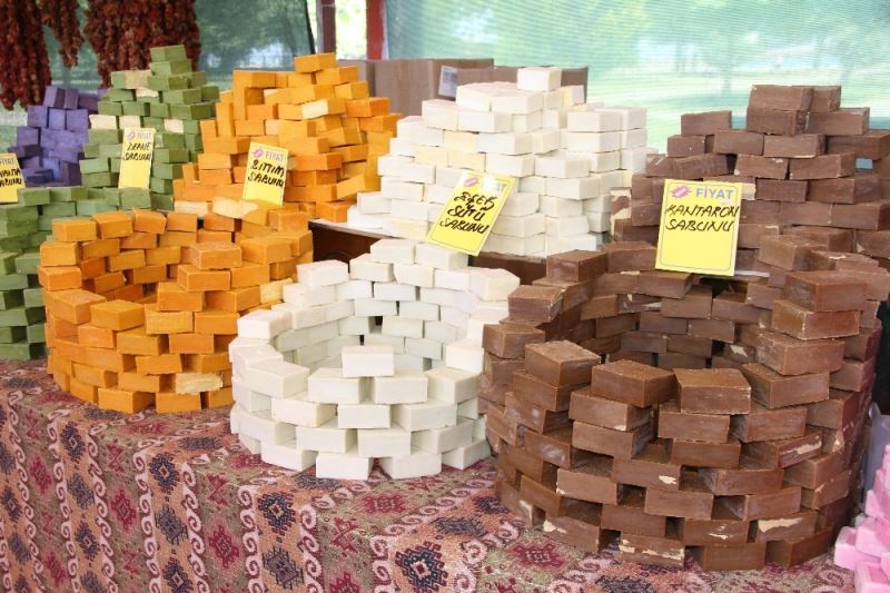 Şifalı sabunlar hakkında konuşan Yeşim Yıldız, “Başka bir yörede bulunmayan zahter ve zeytinhayhali gibi baharatlarımız bulunuyor. Burada bıttım sabunu, kükürt sabunu gibi ürünlerde satıyoruz” ifadelerini kullandı.