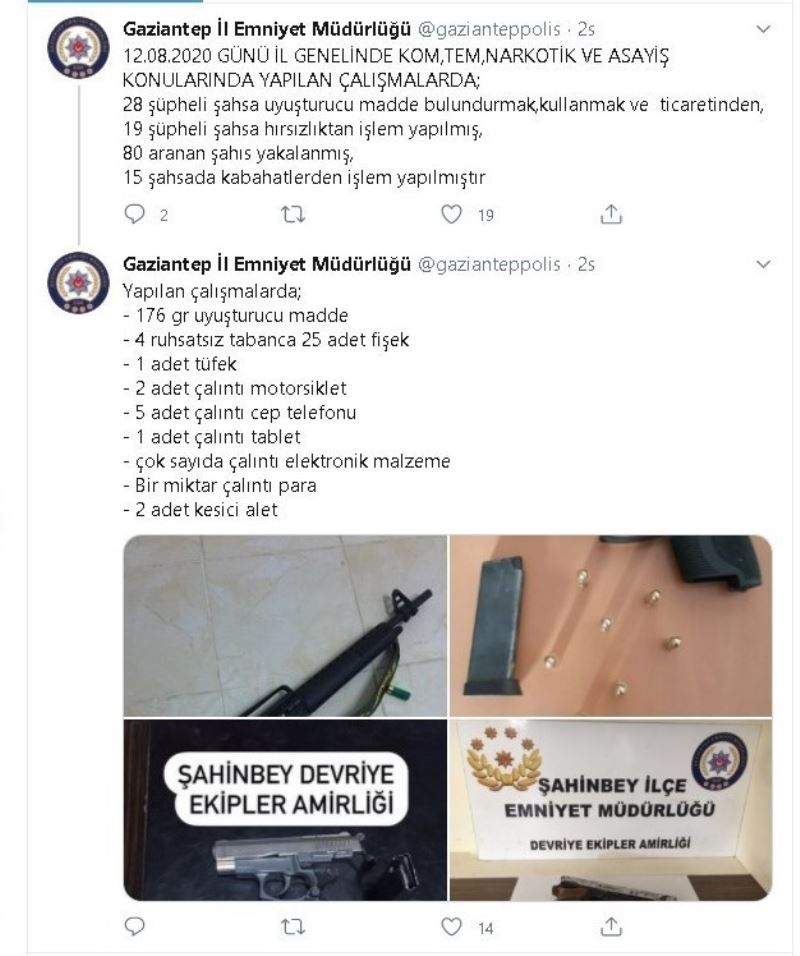Kentte, uyuşturucuyla mücadele kapsamındaki çalışmaları sosyal medya hesabından paylaşan Gaziantep İl Emniyet Müdürlüğü, operasyonda 28 şüphelinin "uyuşturucu bulundurmak ve kullanmak" suçlamasıyla gözaltına alındığını adreslerde yapılan aramalarda ise, 176 gram uyuşturucu, 4 ruhsatsız tabanca, bir av tüfeği, bir hassas terazi ele geçirildiğini duyurdu.