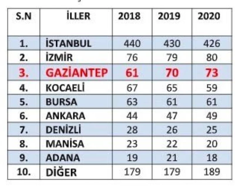 Gaziantep Sanayi Odası (GSO) Yönetim Kurulu Başkanı Adnan Ünverdi, Türkiye İhracatçılar Meclisi (TİM) tarafından hazırlanan İlk 1000 İhracatçı Firma-2020 araştırmasına göre Gaziantep’in 73 firma ile listede en fazla firmaya sahip 3’üncü il olma başarısını gösterdiğini söyledi.