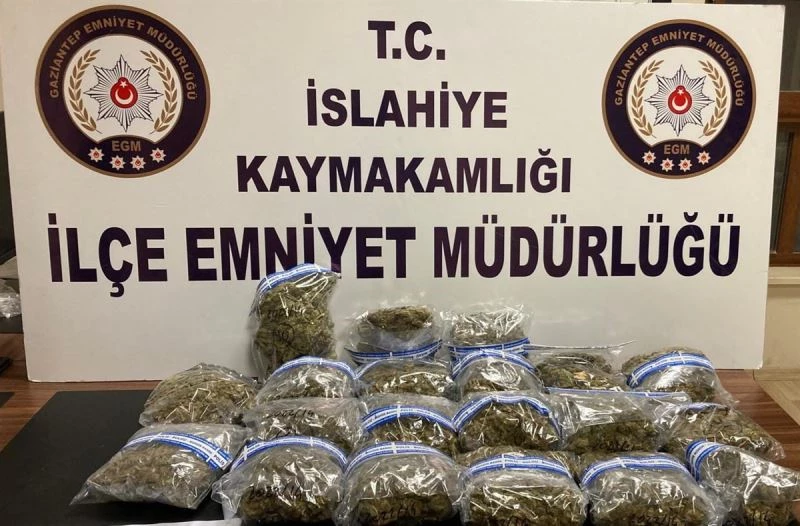 Gaziantep Emniyet Müdürlüğü’ne bağlı Narkotik Suçlarla Mücadele Şube Müdürlüğü İslahiye Narkotik Grup Amirliği ekipleri, Fevzipaşa Mahallesi tren garında Elazığ-Adana seferini yapan trende 2 yolcudan şüphelendi. Cumhuriyet Başsavcılığı koordinesiyle şüpheli 2 yolcunun üzerinde ve yanında bulunan paketlerde arama yapıldı. Yapılan aramalar neticesinde 10 kilo 630 gram esrar ele geçirildi. Şüpheli 2 şahıs gözaltına alındı.