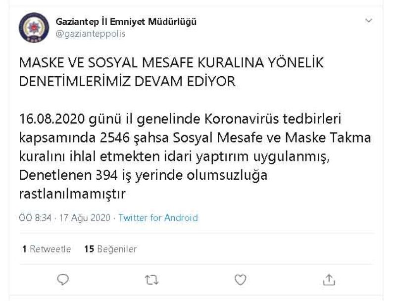 Gaziantep İl Emniyet Müdürlüğü sosyal medya hesabı üzerinden yaptığı açıklamada, “İl genelinde korona virüs tedbirleri kapsamında, 2 bin 546 şahsa Sosyal Mesafe ve Maske Takma kuralını ihlal etmekten idari yaptırım uygulandı” denildi.
