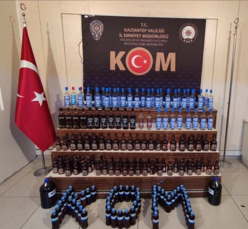 Gaziantep bir işyerine baskın yapan KOM ekipleri 128 şişe kaçak içki ile 39.5 litre dökme alkol yakaladı.