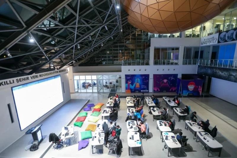 Büyükşehir Belediyesi Gezegen Evi’nde bulunan Akıllı Şehir Veri Koordinasyon Merkezi’nde ki programın sonuna kadar kod yazmaya devam eden öğrenciler sahurla birlikte yazılımlarını tamamladılar.